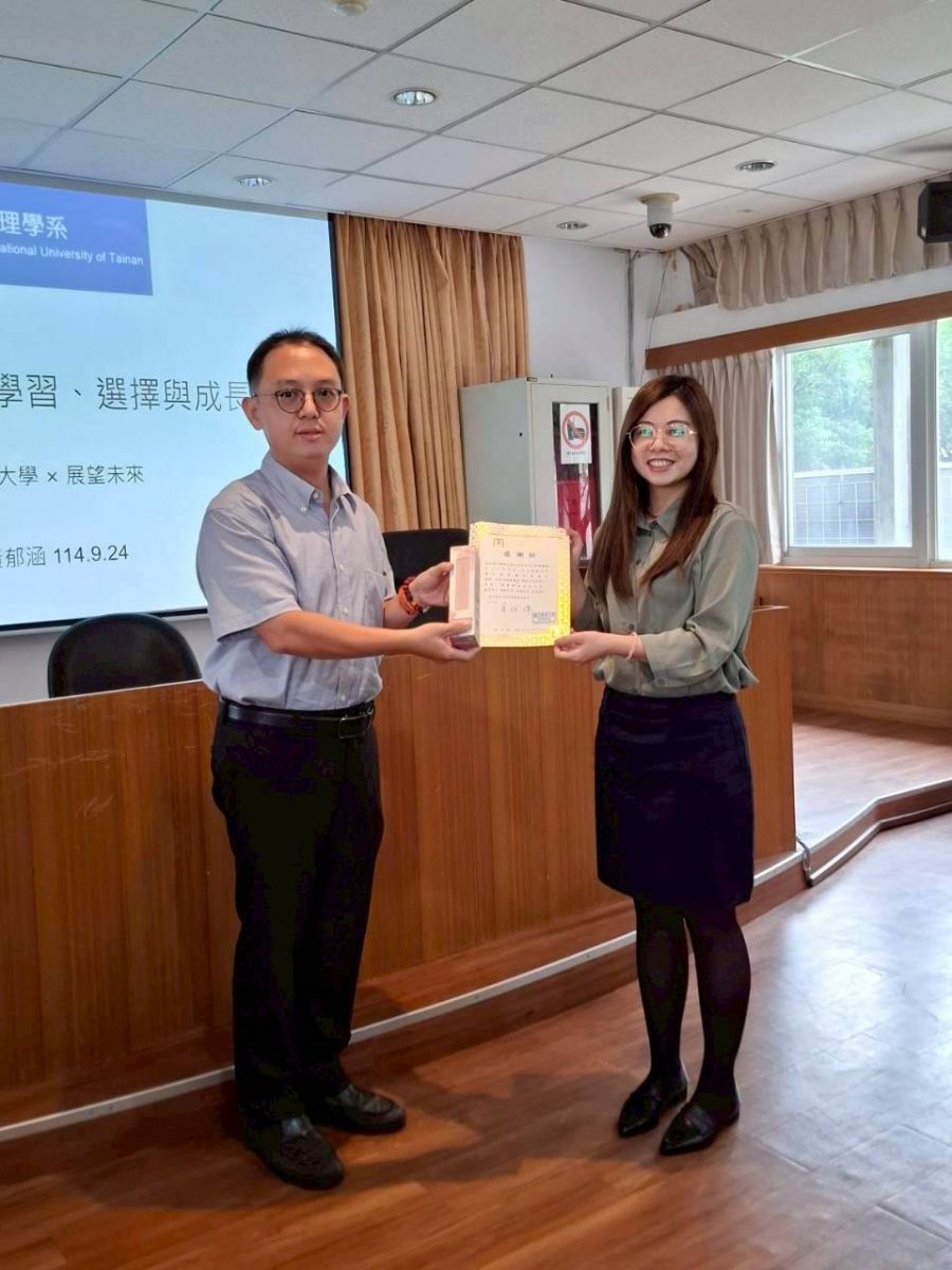 她也介紹臺銀的招考管道與政策貸款,包括就學貸款、青年創業貸款及安心成家貸款,建議同學提早關注金融研訓院資訊,並累積專業證照以提升競爭力。最後,她以三句話勉勵學弟妹:「為美好的結局努力奮鬥」、「不做不會怎樣,做了很不一樣」、「人生不同階段有不同需求,大學就是試錯的好時機」。