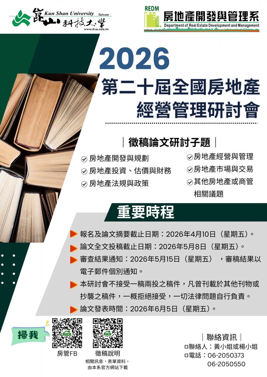 崑山科技大學「2026第二十屆全國房地產經營管理研討會」論文徵稿訊息,鼓勵師生踴躍投稿!!