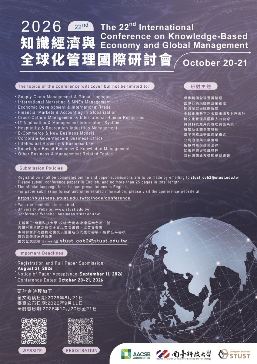 南臺學校財團法人南臺科技大學主辦「2026第二十二屆知識經濟與全球化管理國際研討會」訂於115年10月20日至21日舉行,徵稿相關資料如附件,並請鼓勵貴校師生踴躍投稿參加!一、本研討會全程以英文進行,歡迎國內外學者專家投稿,共襄盛舉。