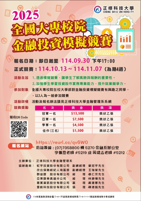 正修學校財團法人正修科技大學金融管理系舉辦「2025全國大專校院金融投資模擬競賽」,鼓勵師生踴躍報名參賽!!一、報名日期:即日起至9月30日(星期一)17:00止。