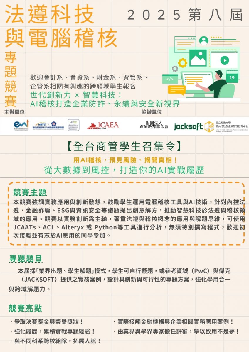2025年法遵科技與電腦稽核專題競賽已開始, 敬邀您輔導學生組隊一同參與。相關2025年法遵科技與電腦稽核專題競賽資訊如下: