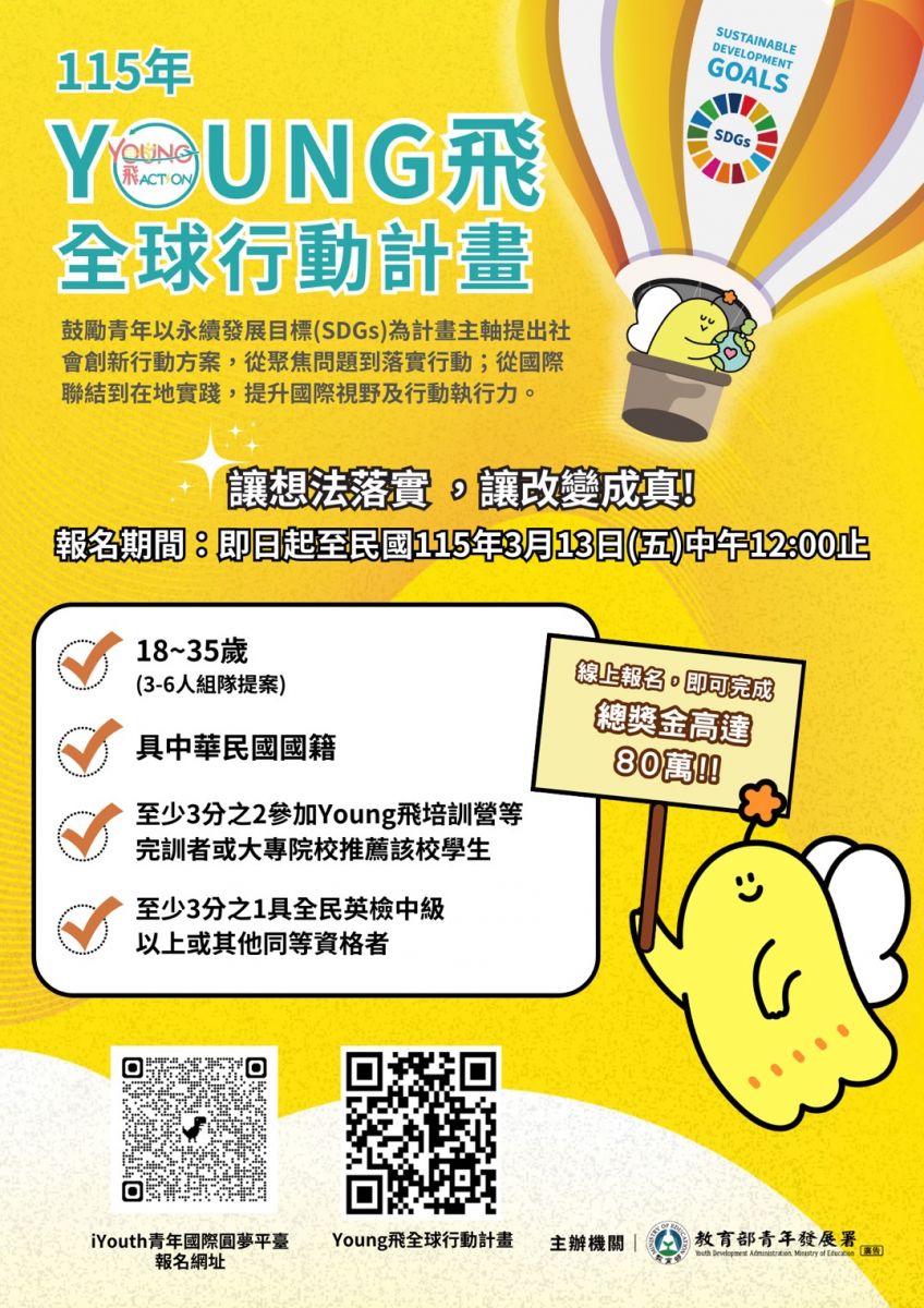 教育部青年發展署(下稱本署)為鼓勵國內青年組隊自主提案,培訓青年聯結國際組織及實踐臺灣在地行動,藉以增進青年對國際事務及永續發展目標之認識與理解, 培育國際事務及永續行動人才, 提升青年國際視野及行動執行力 。